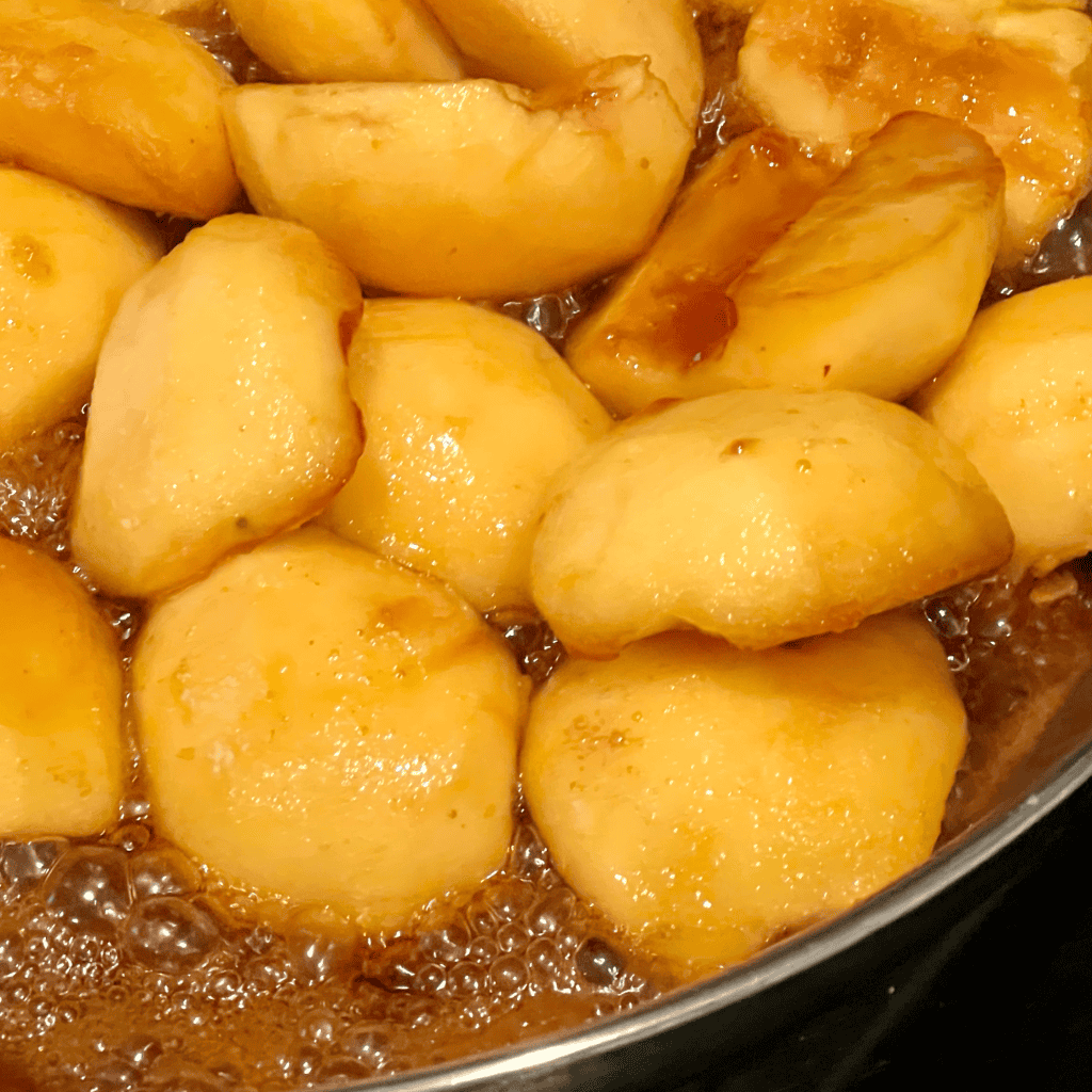 I cut them into thirds, smothered them in butter and sugar and baked them into a tatin (recipe via Smitten Kitchen). The kitchen filled with the smell of butter darkening toward toffee. My mom and son lingered by the stove beside me. Through the oven window, the puff pastry rose and browned while the syrup bubbled and the apples slumped gently into each other below.